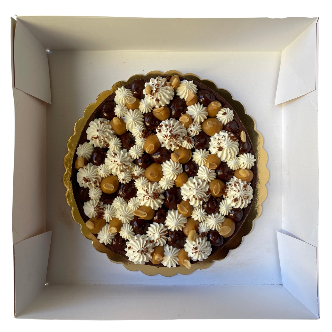 La nostra Crostata Dessert è una base di frolla fragrante al cacao farcita a strati con caramello, crema al formaggio morbida e una ganache al cioccolato fondente liscia e avvolgente.